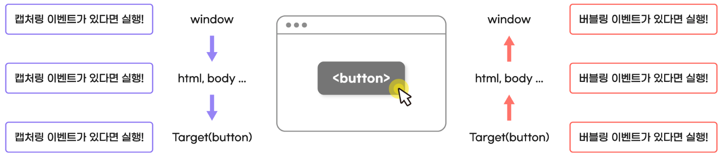 - DOM의 자식노드에서 부모노드로 전달되는 것, 캡처링 이벤트를 다 찾으면 타겟에서 윈도우로 다시 돔트리를 타고 올라감